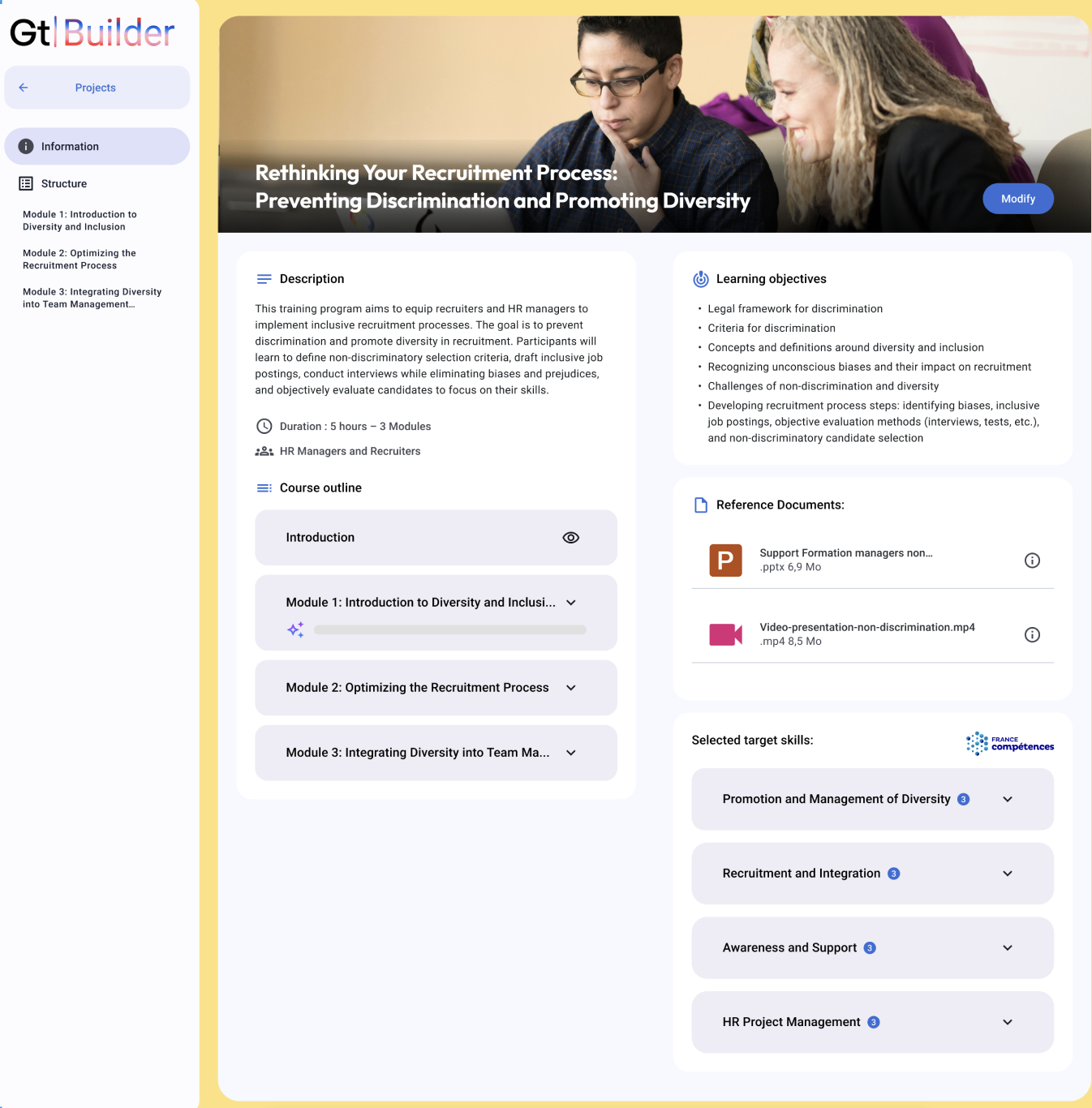 - AI Course Builder : Cet outil permet de générer rapidement des activités immersives et interactives, transformant automatiquement des documents statiques en modules pédagogiques complets. Il facilite la personnalisation des contenus pour répondre aux besoins spécifiques des apprenants, tout en accélérant le processus de création de formations.